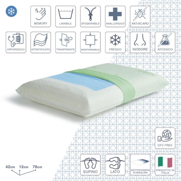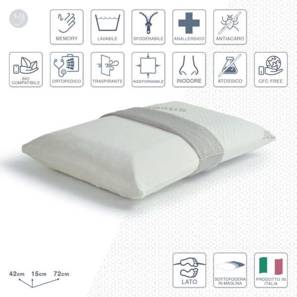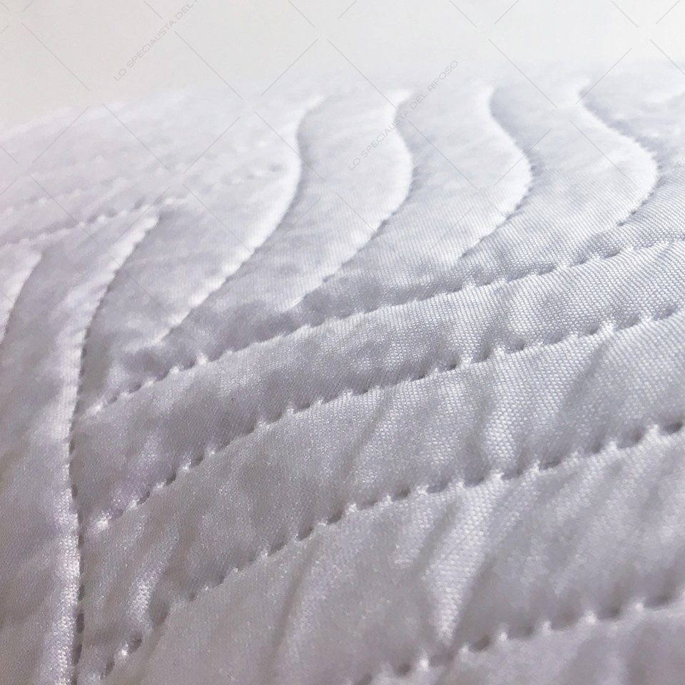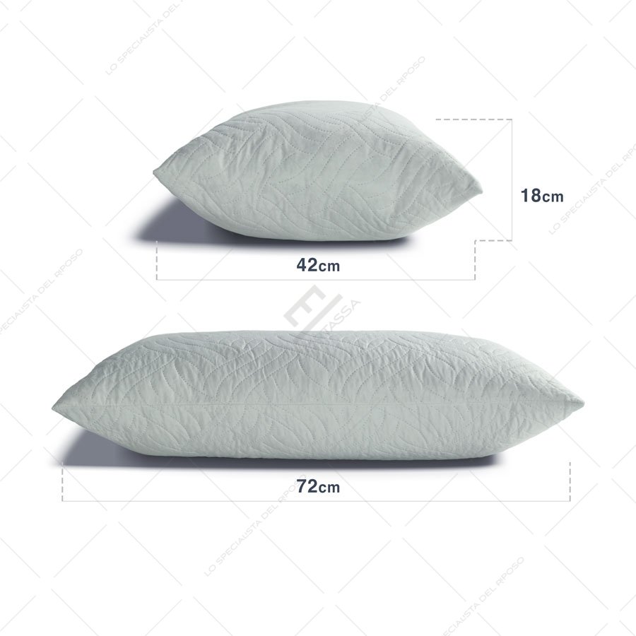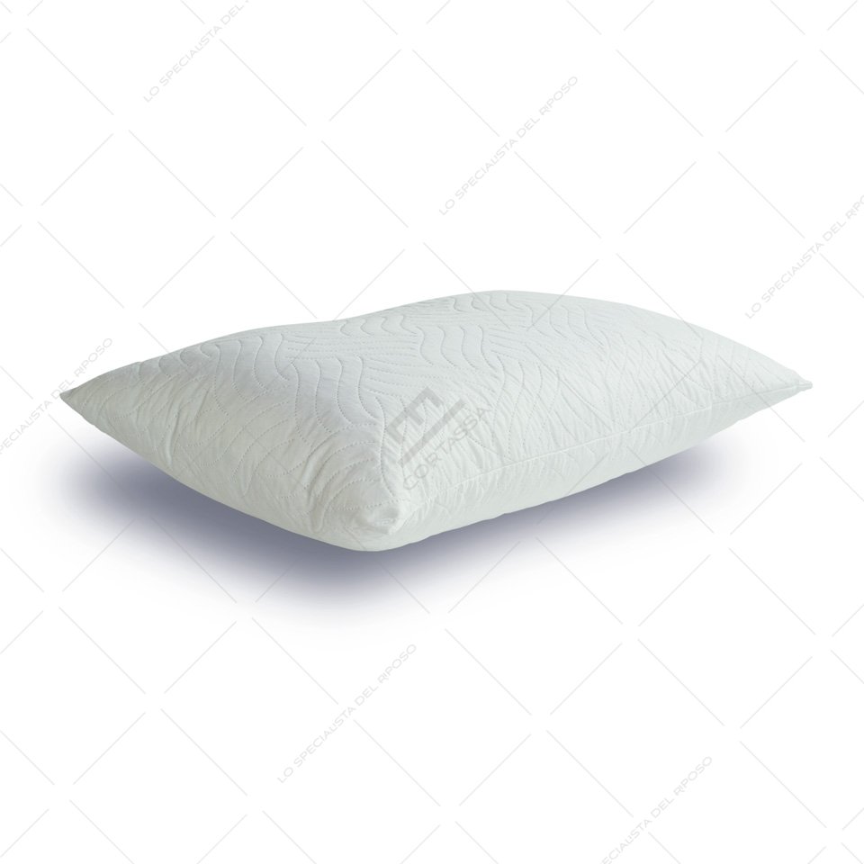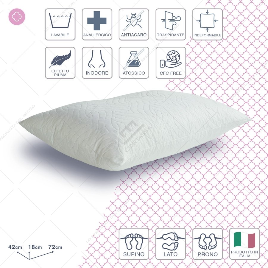 Guanciale imbottito con fibra di cava siliconata con effetto piumino. Questo guanciale è realizzato secondo le più rigorose norme igieniche; privo di tossicità latente.