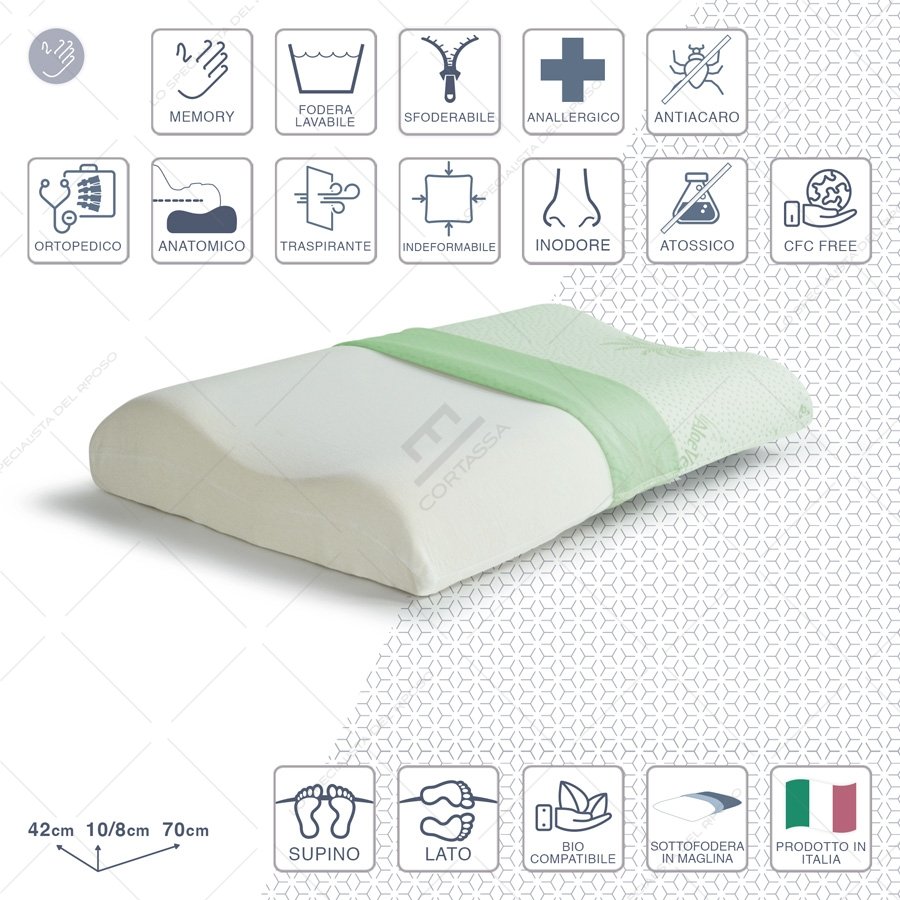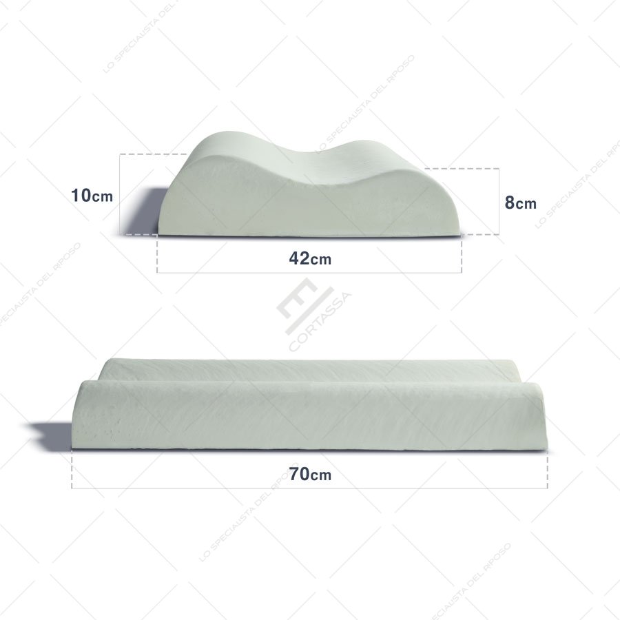 La particolare forma a doppia onda e la struttura visco elastica del memory, fanno di questo cuscino un prezioso aiuto per alleviare i dolori cervicali.