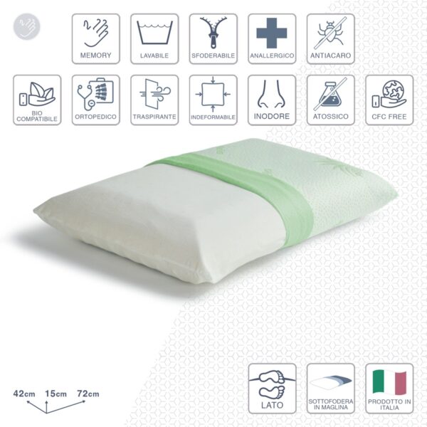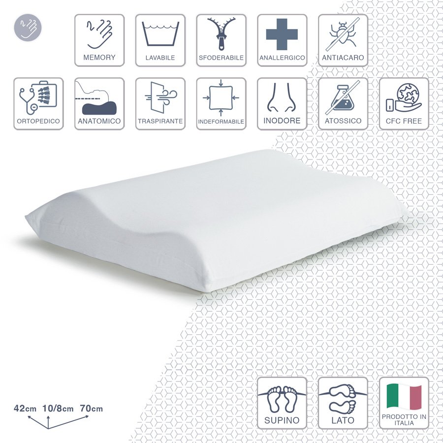 La particolare forma a doppia onda e la struttura visco elastica del memory, fanno di questo cuscino un prezioso aiuto per alleviare i dolori cervicali.