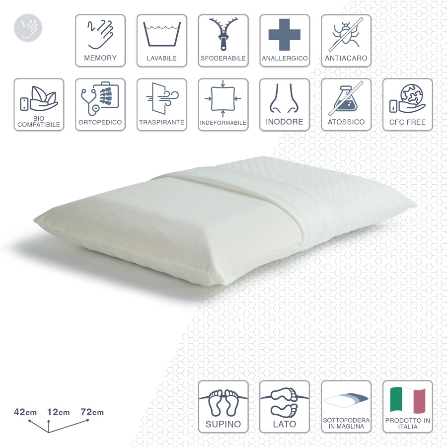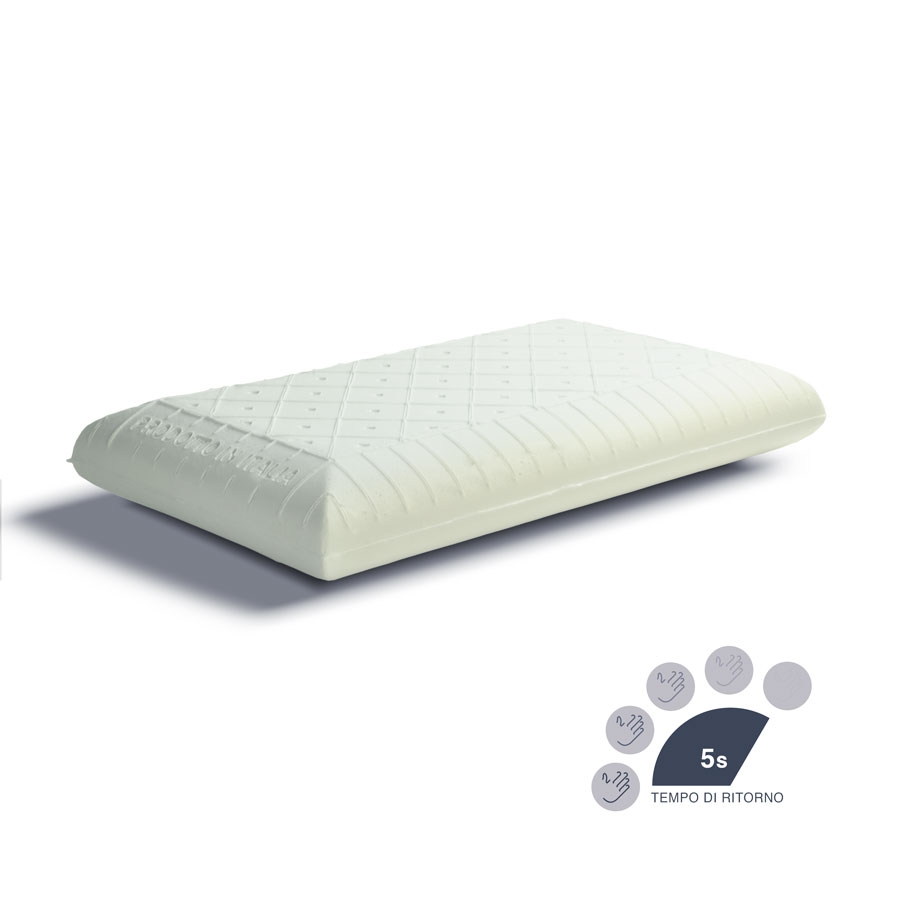 Guanciale in Memory avvolgente morbido e automodellante. Si adatta alle forme alleviando i punti di tensione e favorendo una corretta postura. Grazie alla struttura a cellule aperte, favorisce il microcircolo dell’aria, e garantisce un comfort sempre asciutto.