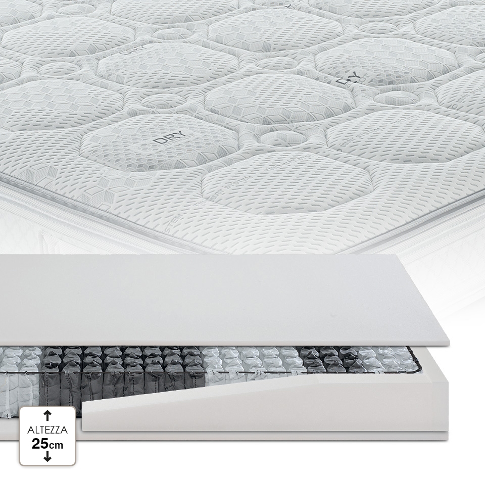 Questo rivestimento mantiene il corpo asciutto e fresco durante il sonno. L’utilizzo di una particolare fibra tecnica innovativa e leader nella gestione dell’umità, conferisce al tessuto un ottimo controllo regolatore della temperatura della pelle e dell’idratazione corporea.