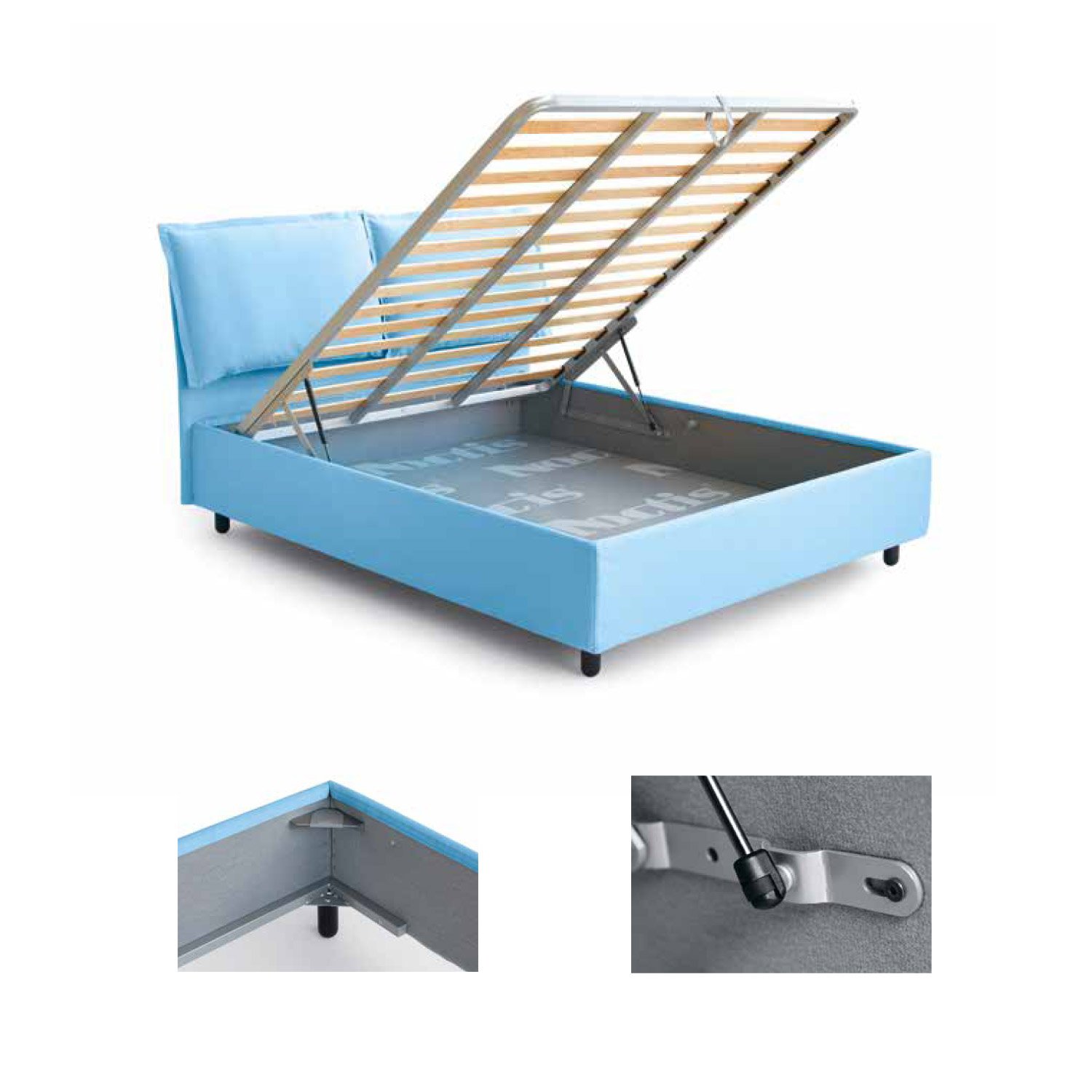 Il sistema contenitore Box Plus caratterizza i prodotti Noctis da sempre. La solida struttura in ferro perimetrale che collega tra loro testata, fascioni e pediera rende estremamente solido e robusto il vano contenitore. I pannelli di fondo sono realizzati in HDF, oggi aumentati di spessore, per garantire solidità e durata nel tempo.