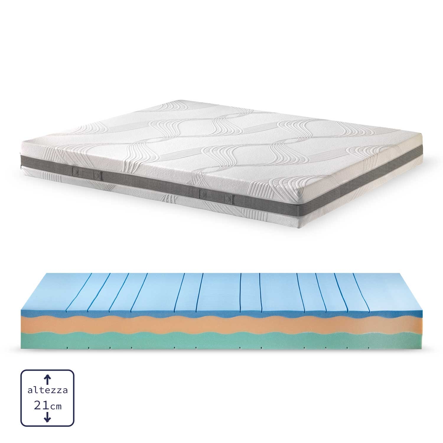- Strato 1 – Memory Ergo Fresh 4 cm: memory a cellula aperta che si adatta con calore e pressione, decomprime spalle e anche e migliora il microclima.