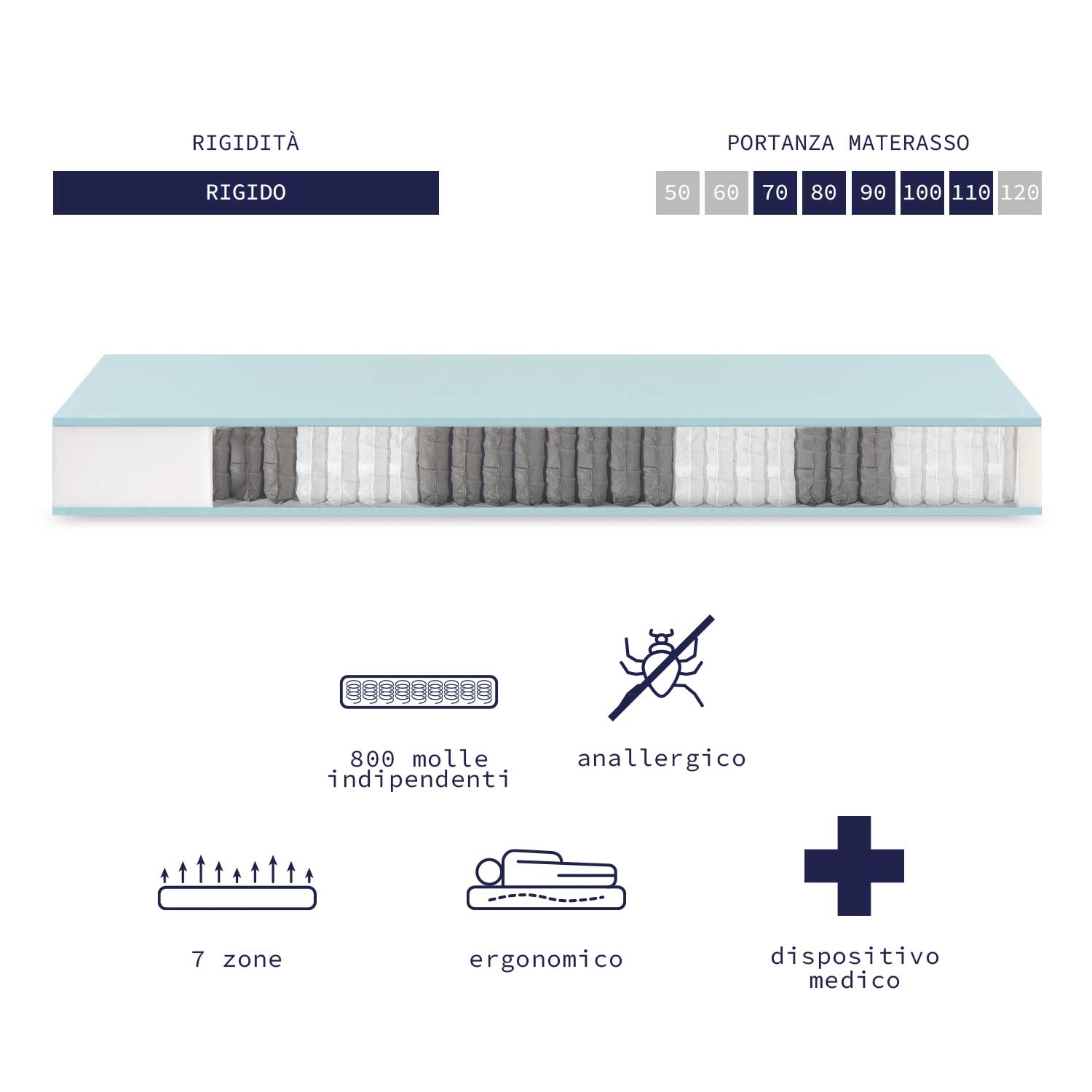 Greco 800 è un materasso ibrido che combina una lastra ergonomica ad alta resilienza con 800 molle insacchettate per offrire sostegno deciso, stabilità e ottima traspirazione. 7 zone; cover Soft Touch sfoderabile con fibra su 2 lati.