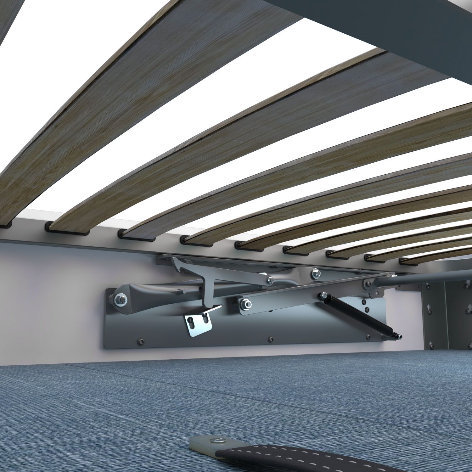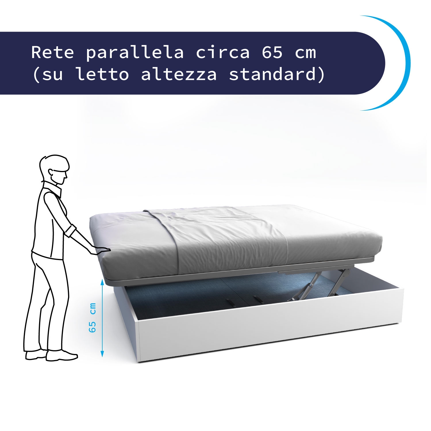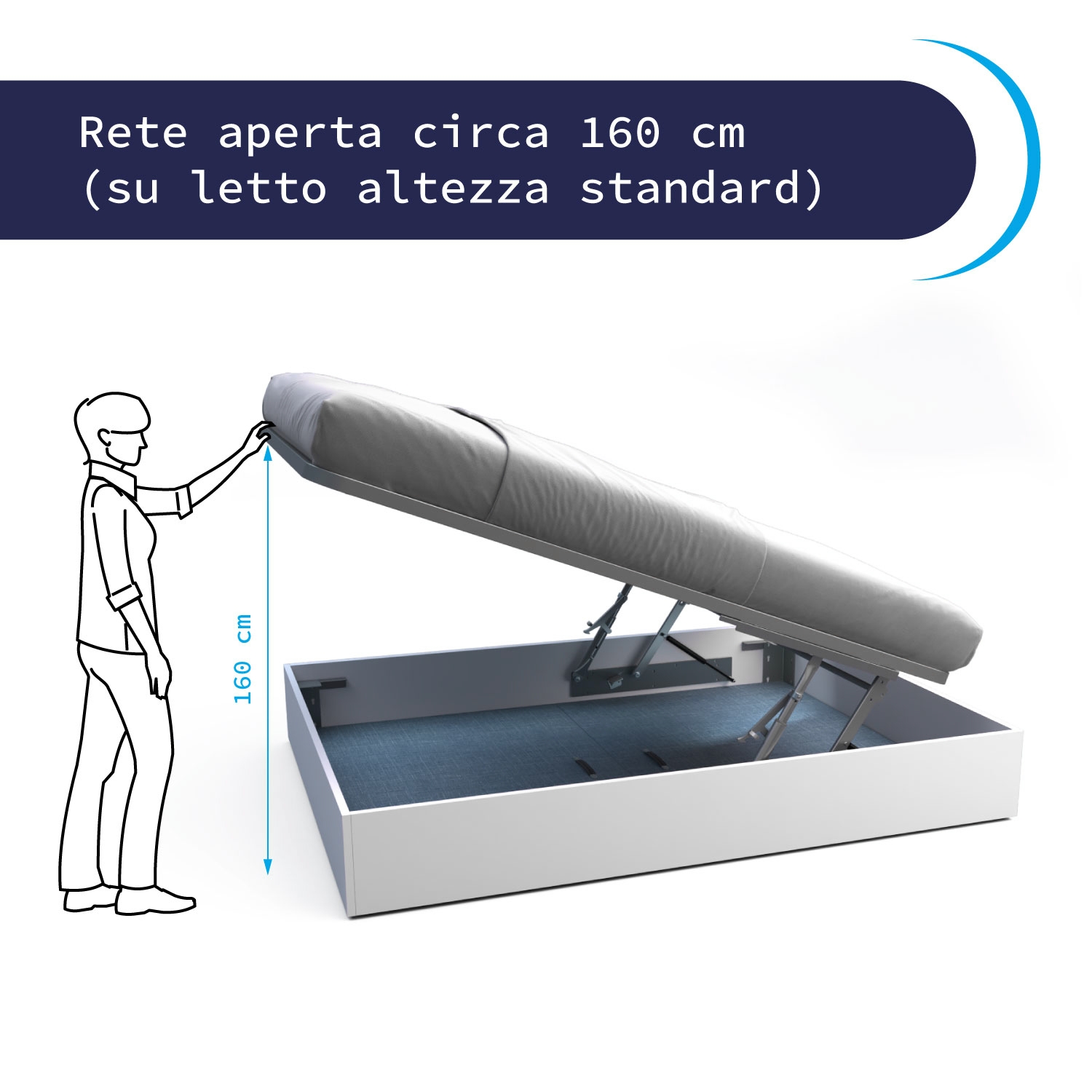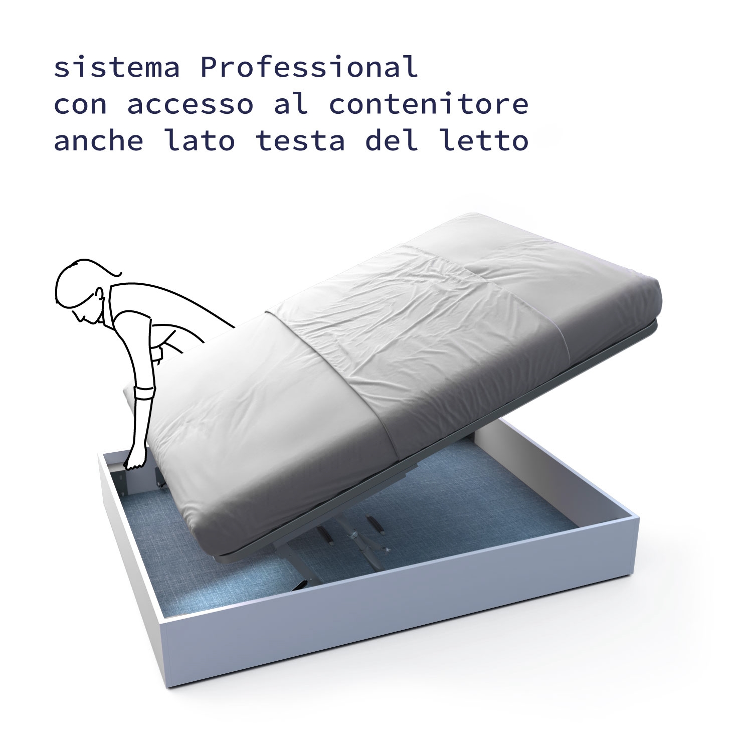 Il sistema di sollevamento Professional permette di sollevare il letto in due posizioni distinte: ad angolo fino a 45° per un facile accesso al vano contenitore e orizontale e sollevato per facilitare il cambio e il rifacimento del letto.