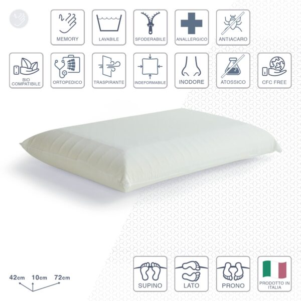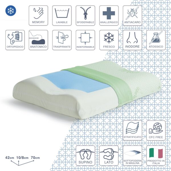 - Copriguanciale con cerniera, morbido e removibile. Lasciate il copriguanciale "invernale" con cerniera per maggior comfort, oppure toglietela per ottenere il massimo effetto rinfrescante di Technogel®. In entrambi i casi, ricordate di utilizzare sempre una federa.