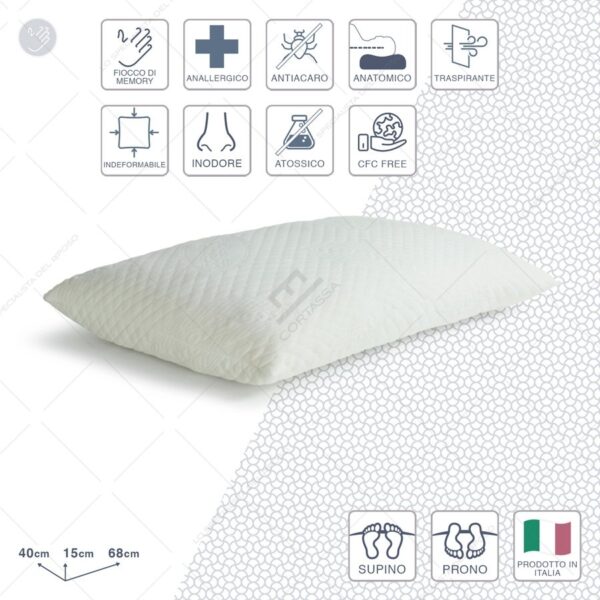 - Persone che dormono sulla schiena o sul fianco. Per persone che dormono sulla schiena o sul fianco di taglia medio-grande che abbiano il collo corto o che preferiscano un guanciale che si adatti alle spalle, di modo che la testa poggi confortevolmente sulla superficie sagomata.