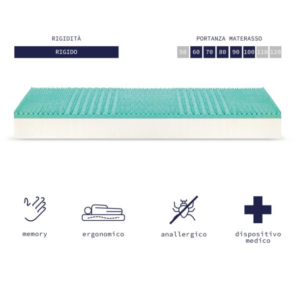 Topper in memory foam, termosensibile allevia la pressione nei punti di contatto e si adatta in modo personalizzato al profilo del corpo. Con elastici sugli angoli per fissaggio al materasso